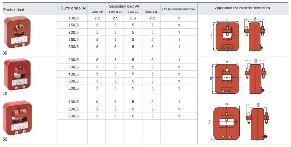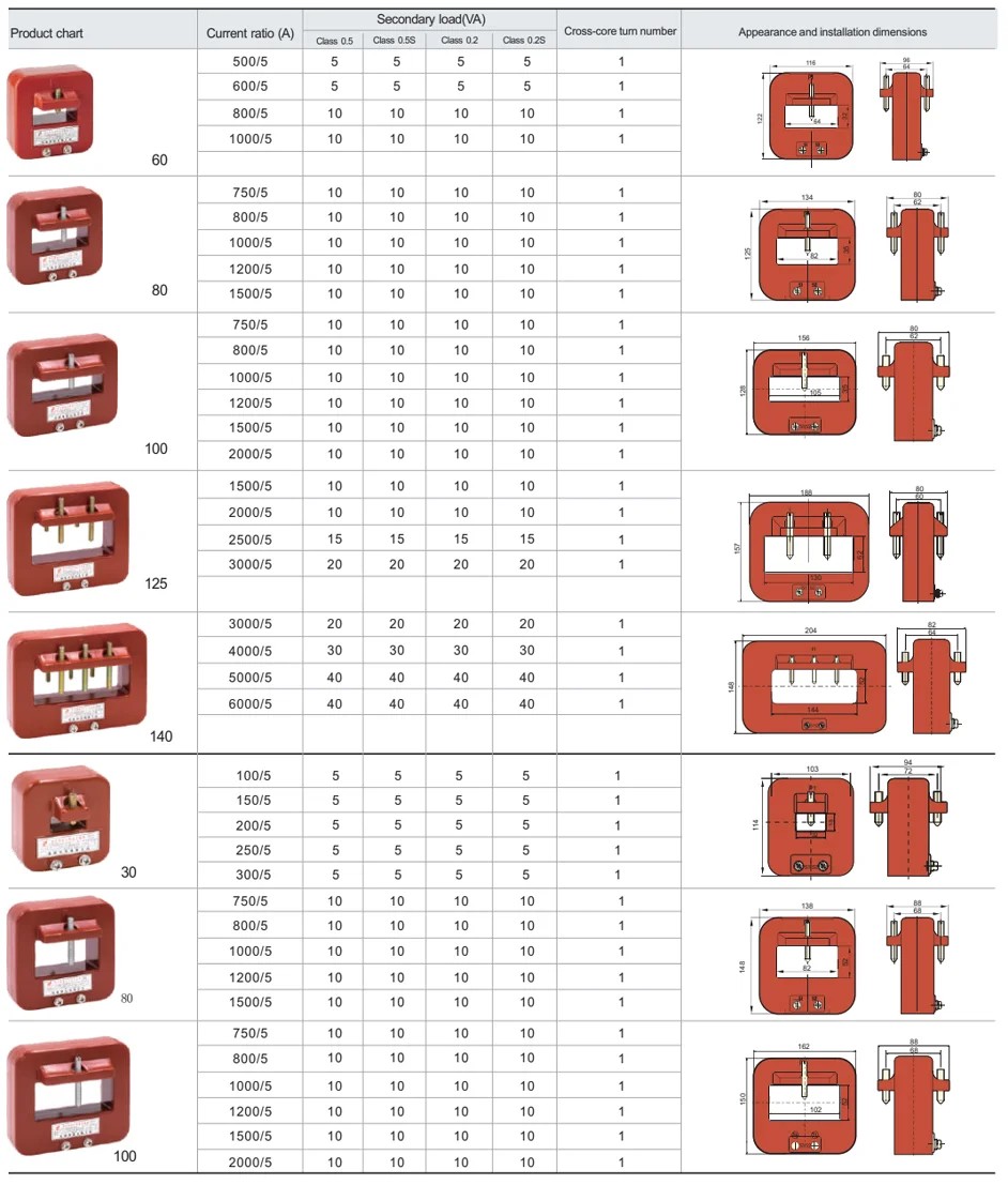 Үлгі Номиналды ток коэффициенті(A) Автобус бар Өткізу бұрылыстары Дәл деңгей және номиналды шығыс (VA)COSφ =0,8 Номиналды оқшаулау деңгейі (кВ)