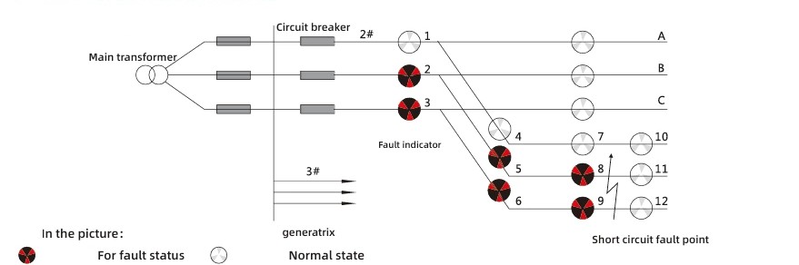 Қысқа тұйықталу құбылыстарының сипаттамаларына сүйене отырып, әрекет критерийі ретінде қорғаныс құрылғысының электр қуатының үзілуімен жүретін қысқа тұйықталу кезінде токтың кенеттен өзгеруі қолданылады. Ақаулық индикатор диаграммасын түсіндіру әдісі келесідей: 2-жолдың А фазасының 2, 5 және 8 индикатор шамдары В фазасында индикатор шамдары жанбаған кезде, С фазасының 3, 6 және 9 индикатор шамдары қызыл болып жанған кезде, 11 және 12 индикатор шамдары ақ болып қалатын болса, сол шығыс желі нүктесінде қысқа тұйықталу ақаулығының орын алғанын анықтауға болады.